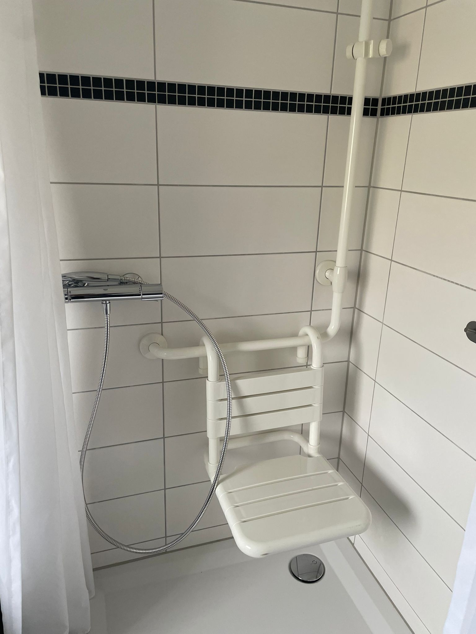 Das barrierefreie Badezimmer ist mit einer ebenerdigen Dusche und einem Notrufsystem ausgestattet. Die Bewegungsfläche im Zimmer und im Sanitärraum beträgt über 150 x 150 Zentimeter, um maximalen Komfort und Sicherheit zu gewährleisten.
