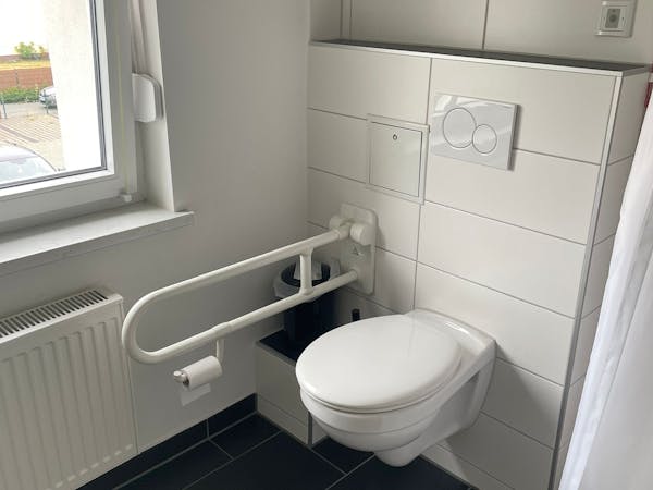 The design of the barrier-free double room is consistent with our other room categories. It is decorated in bright colors and features modern furnishings, including a comfortable double bed accessible from both sides.
