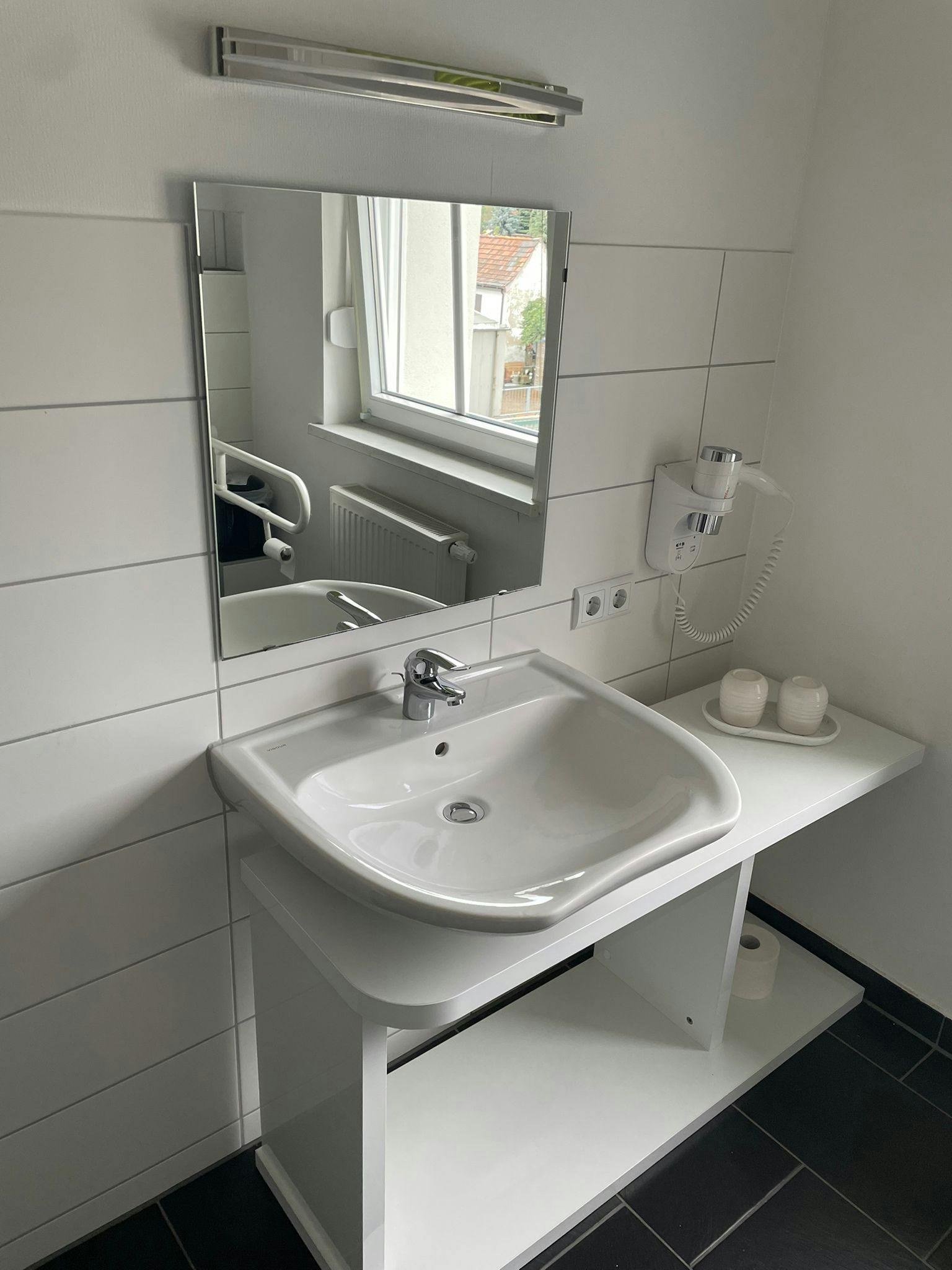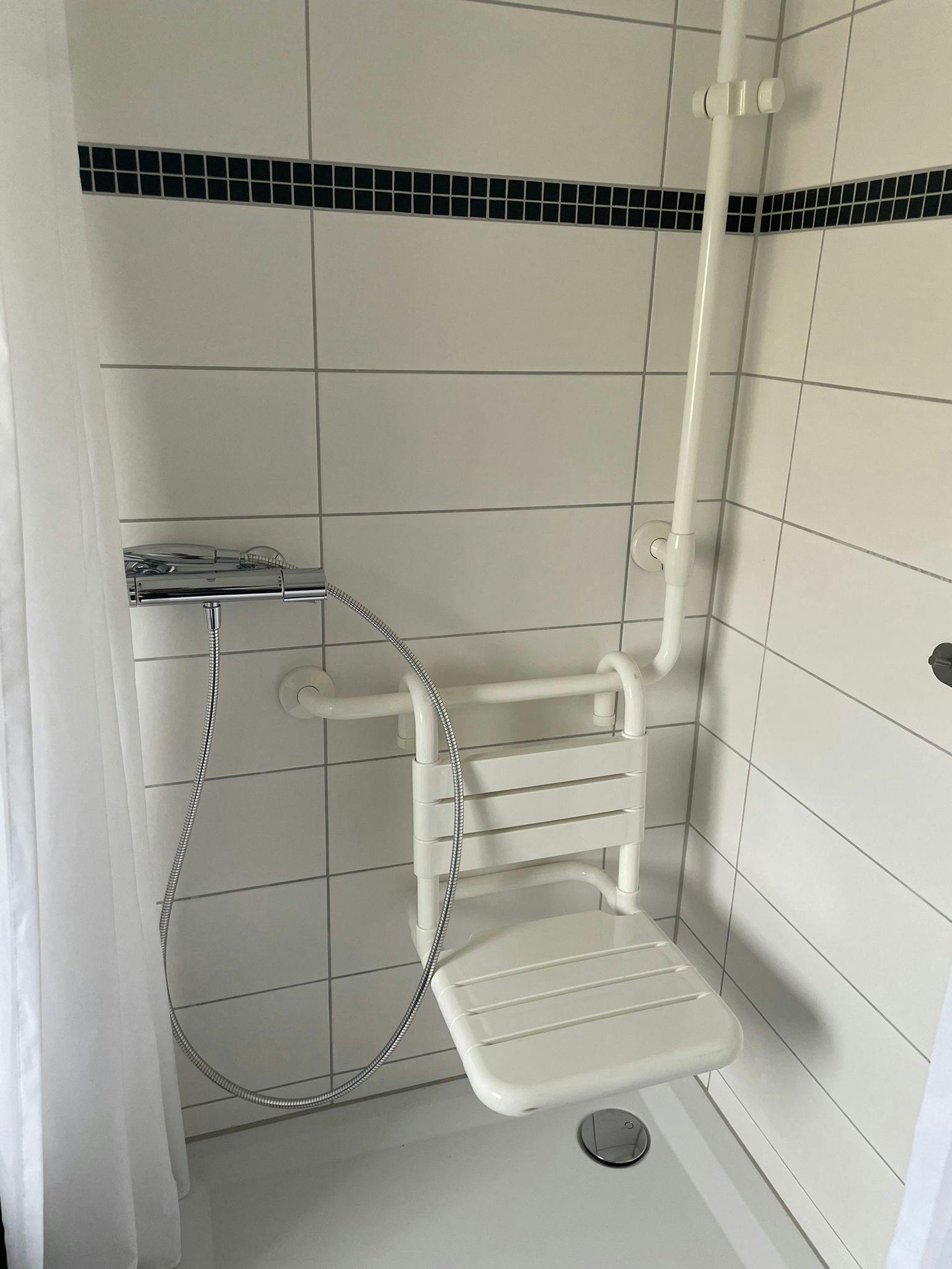 The bathroom is equipped with a walk-in shower and an emergency call option. The accessible space in both the room and the bathroom measures over 1.50 meters x 1.50 meters.